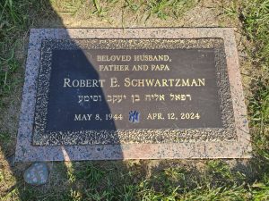 We arrived at “Robert E. Schwartzman. רפאל אליה בן יעקב וסימע Raphael Elijah ben Yaakov v Simma. May 8, 1944-April 12, 2024.” Beloved husband, father and papa. Generations from now, if the world hasn’t been destroyed or the cemetery paved over, future mourners will encounter those words, telling them almost nothing about a man who once lived.
